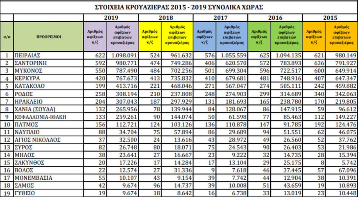 Σύμφωνα με τα στοιχεία της Ένωσης Λιμένων Ελλάδος (ΕΛΙΜΕ), οι αφίξεις κρουαζιερόπλοιων σε 43 λιμάνια της χώρας ανήλθαν το 2019 στις 3.899 (από 3.410 το 2018), σημειώνοντας αύξηση 14,34% και οι αφίξεις επιβατών κρουαζιέρας ανήλθαν στα 5.537.500 (από 4.788.642 το 2018), σημειώνοντας αύξηση 15,64%. [bsa_pro_ad_space id=6] Πειραιάς 2019: