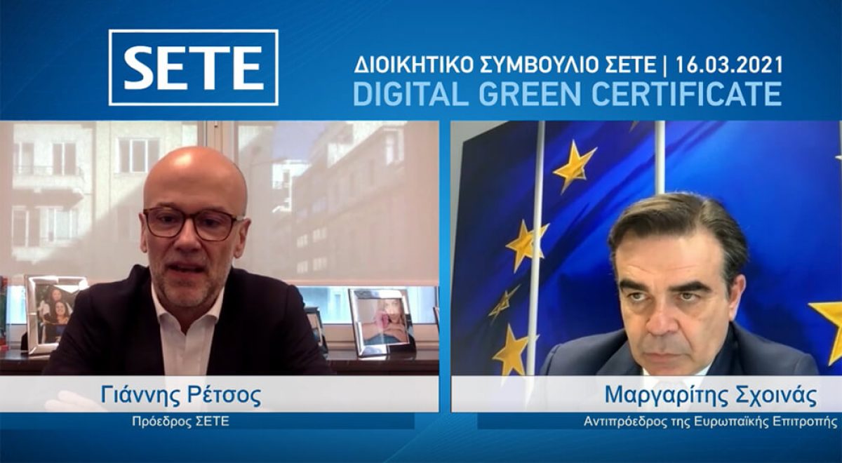 Σε τηλεδιάσκεψη που διοργανώθηκε προχθές (16/03) από το Σύνδεσμο Ελληνικών Τουριστικών Επιχειρήσεων (ΣΕΤΕ), ο Αντιπρόεδρος της Ευρωπαϊκής Επιτροπής, Μαργαρίτης Σχοινάς ενημέρωσε τον Πρόεδρο, Γιάννη Ρέτσο και τα Μέλη του Διοικητικού Συμβουλίου του Συνδέσμου, για τις βασικές αρχές που θα διέπουν την εφαρμογή του ψηφιακού πιστοποιητικού