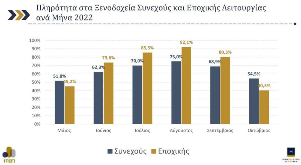 Η μέση πληρότητα των ξενοδοχείων της Ελλάδας τον Αύγουστο του 2022 ξεπέρασε οριακά αυτήν του αντίστοιχου μήνα του 2019, ήταν ένα από τα βασικά συμπεράσματα της (ετήσιας) έρευνας για τον ξενοδοχειακό κλάδο το 2022, που διεξήγαγε το Ινστιτούτο Τουριστικών Ερευνών και Προβλέψεων (ΙΤΕΠ) για λογαριασμό