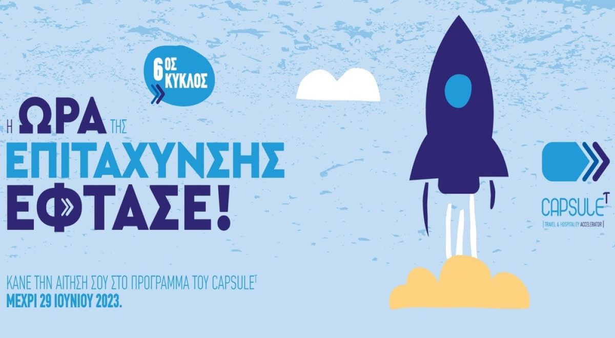 Συνεχίζονται έως την Πέμπτη, 29 Ιουνίου 2023, οι αιτήσεις για τον 6ο κύκλο του Προγράμματος Επιτάχυνσης του CapsuleT Travel & Hospitality Accelerator, μια πρωτοβουλία του Ξενοδοχειακού Επιμελητηρίου Ελλάδας (ΞΕΕ). Ο κύριος στόχος του επιταχυντή, είναι να προσφέρει ουσιαστική υποστήριξη και καθοδήγηση μέσα από το δωρεάν πλούσιο