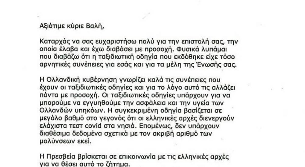 Απάντηση στην Ένωση Ξενοδόχων του νομού Σάμου, η οποία με επιστολή της διαμαρτυρόταν για την ταξιδιωτική οδηγία της Ολλανδίας για τα ελληνικά νησιά, λόγω της πανδημίας του κορονοϊού, έδωσε η πρέσβης της Ολλανδίας στην Αθήνα, Stella Ronner - Grubacic. Στην επιστολή της προς τον πρόεδρο της
