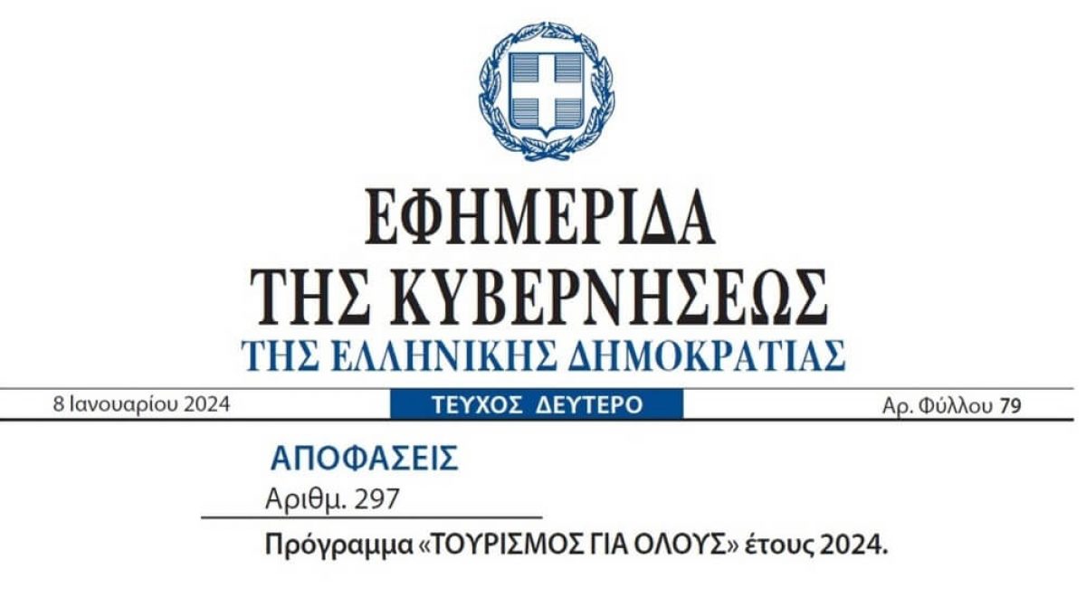 Δημοσιεύθηκε στην Εφημερίδα της Κυβερνήσεως - ΦΕΚ (Β’ 79/2024) η με α.π. 297/05.01.2024 κοινή υπουργική απόφαση με όλες τις λεπτομέρειες του προγράμματος Τουρισμός για Όλους έτους 2024 του Υπουργείου Τουρισμού, με φορέα υλοποίησης την Κοινωνία της Πληροφορίας Μ.Α.Ε.   [bsa_pro_ad_space id=6]   Σκοπός του Προγράμματος είναι η ενίσχυση της