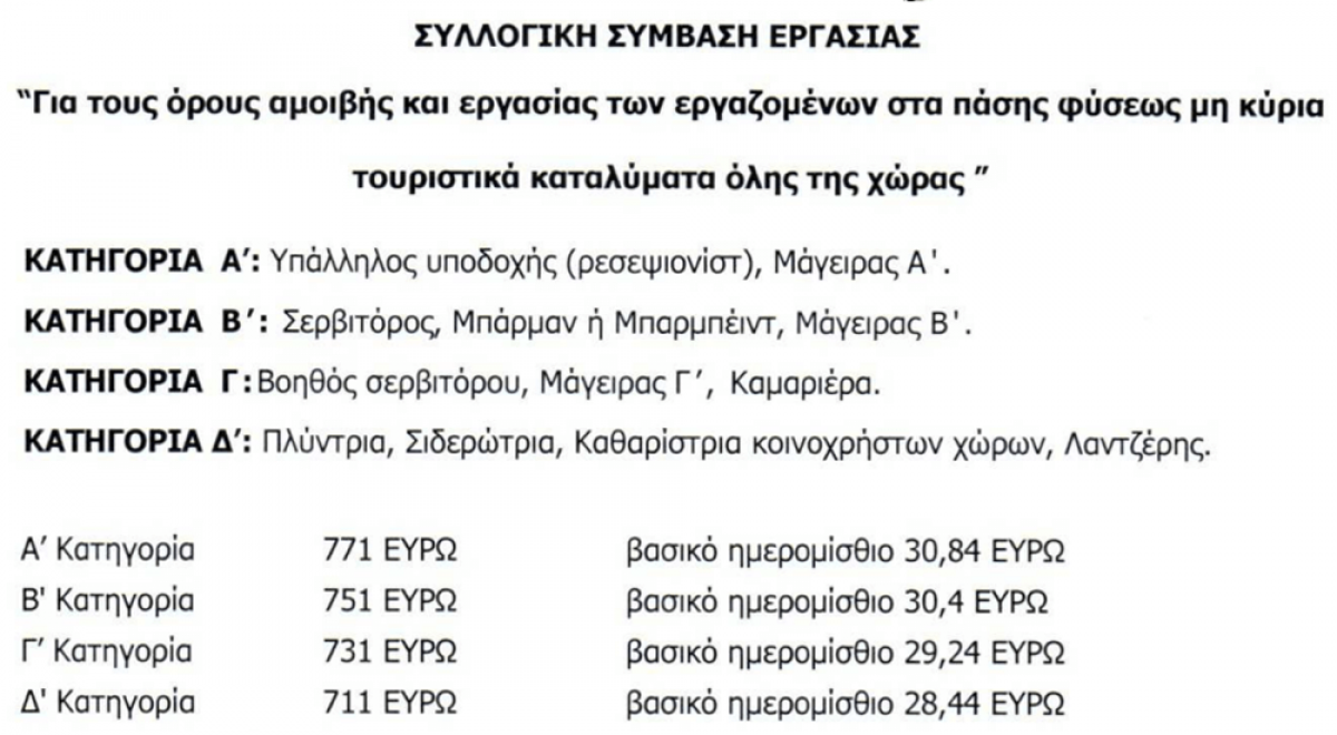 Οι βασικοί μισθοί των εργαζομένων στα μη κύρια ξενοδοχειακά καταλύματα, κυμαίνονται από 711 ευρώ έως 771 ευρώ και τα ημερομίσθια από 28,44 έως 30,84 ευρώ, ανάλογα με την κατηγορία στην οποία ανήκει ο εργαζόμενος, σύμφωνα με τη συλλογική σύμβαση εργασίας που επεκτάθηκε από το υπουργείο