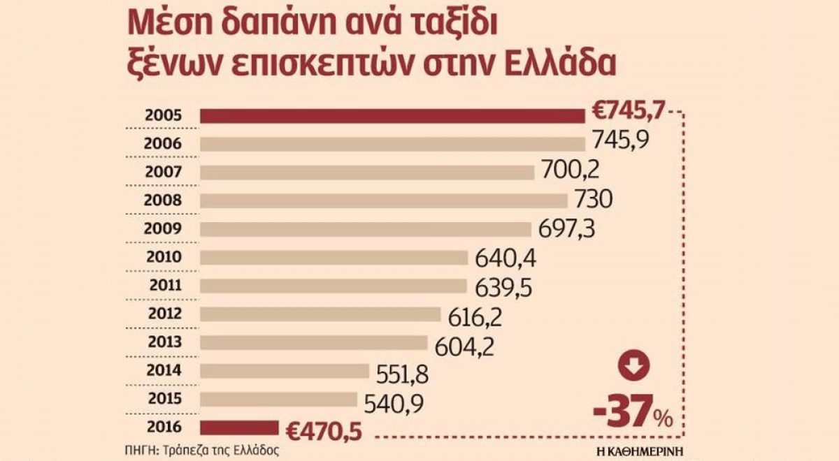 Ανησυχητικά για την πορεία των εσόδων στον τουρισμό είναι τα στοιχεία που παραθέτει σε μελέτη του, με θέμα «Τουρισμός και ανάπτυξη: Bασικά μεγέθη, κλαδικές διασυνδέσεις, αγροτροφικό σύστημα», το Ινστιτούτο Εργασίας της ΓΣΕΕ. Σύμφωνα με τη μελέτη, η μέση δαπάνη ανά τουρίστα από 745,7 ευρώ το 2005,