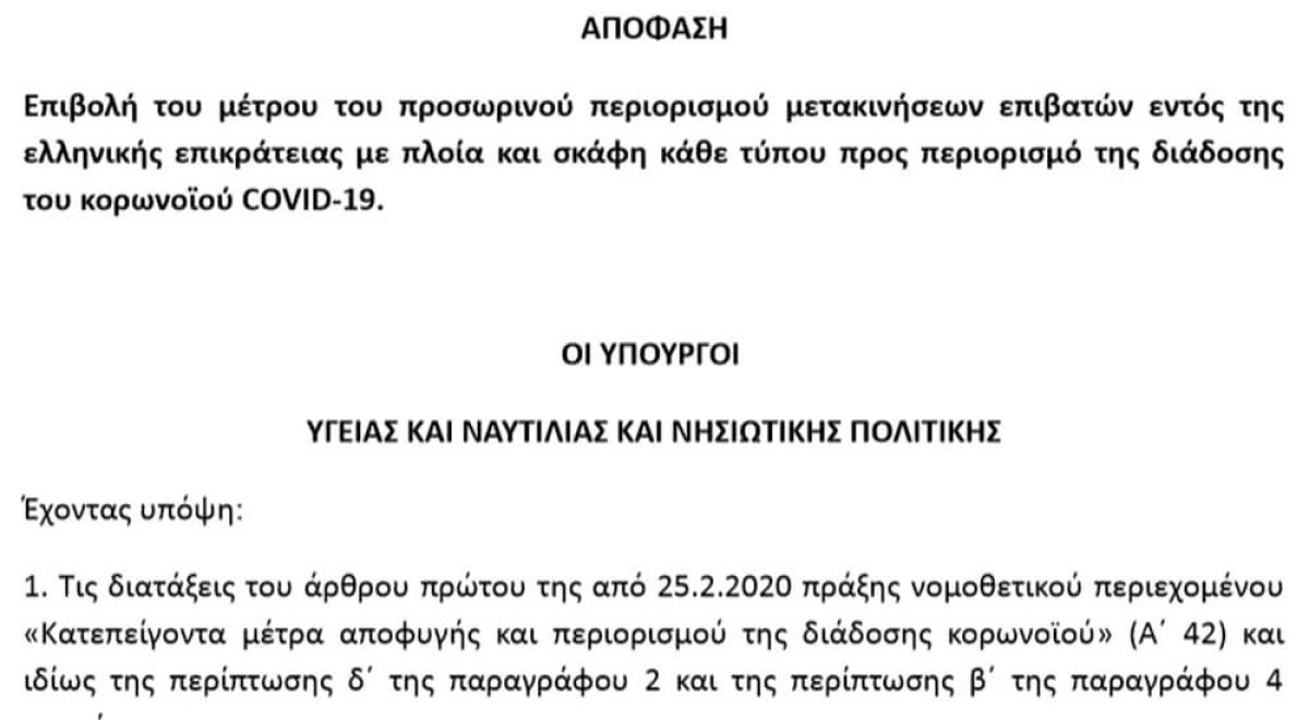 Το υπουργείο Ναυτιλίας προχώρησε στη λήψη μέτρων για τον προσωρινό περιορισμό των μετακινήσεων επιβατών εντός της ελληνικής επικράτειας με πλοία και σκάφη κάθε τύπου, με σκοπό τον περιορισμό της διάδοσης του κορονοϊού. Τα μέτρα, που ισχύουν το διάστημα 21/03 - 21/04/2020, προβλέπουν τον προσωρινό περιορισμό όλων των
