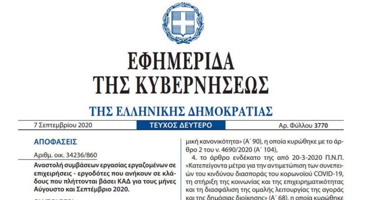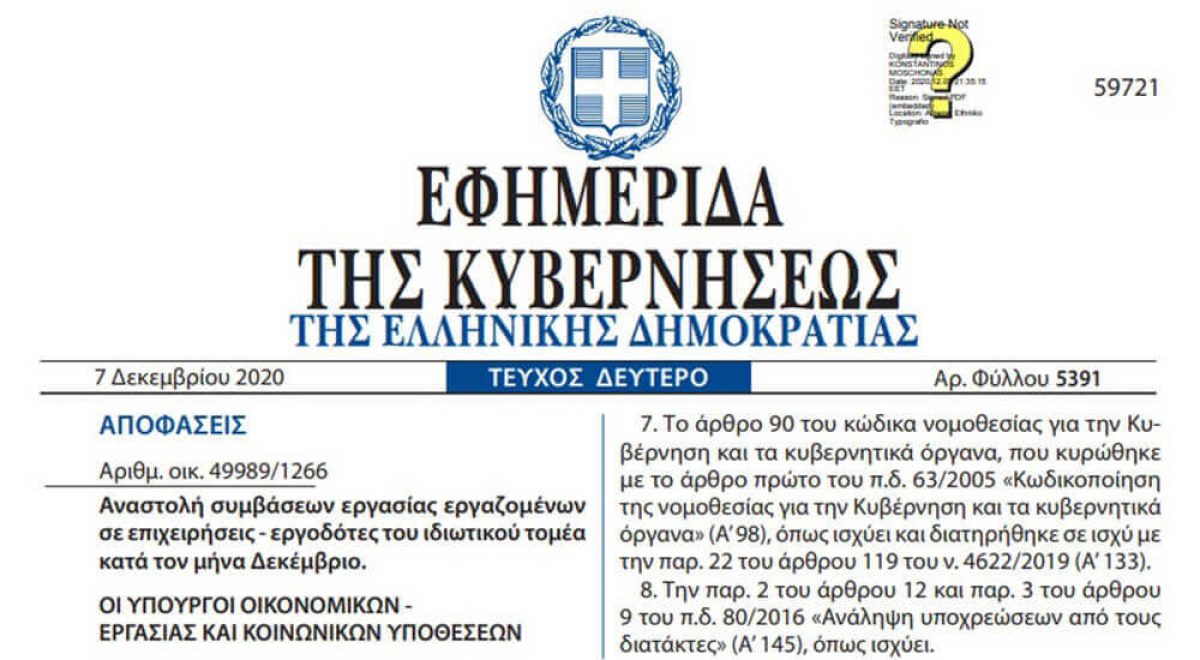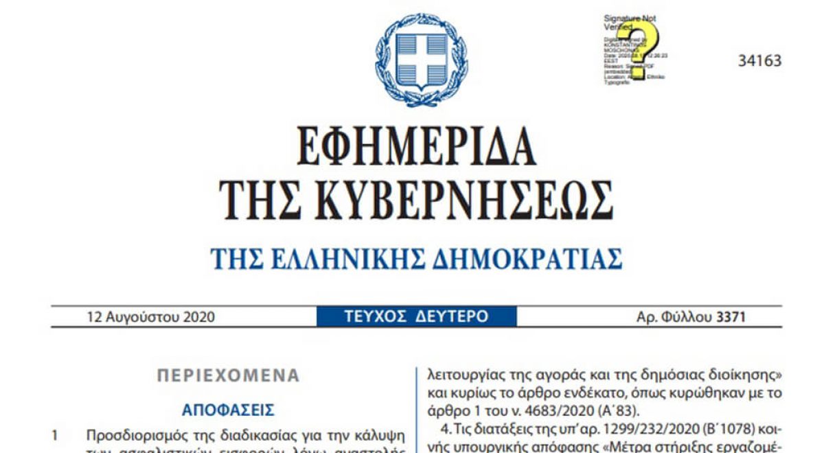 Δημοσιεύθηκε στο Φύλλο Εφημερίδας της Κυβερνήσεως (ΦΕΚ), η Κοινή Υπουργική Απόφαση με Αριθμ. Δ.15/Δ΄/49300/1927 (ΦΕΚ Β’5715/24.12.2020) και θέμα: «Προσδιορισμός της διαδικασίας κάλυψης των ασφαλιστικών εισφορών για τις επιχειρήσεις εργοδότες τουριστικών καταλυμάτων δωδεκάμηνης λειτουργίας, σύμφωνα με τις διατάξεις του άρθρου 123Α του ν. 4714/2020 (Α΄ 148), όπως προστέθηκε με το άρθρο
