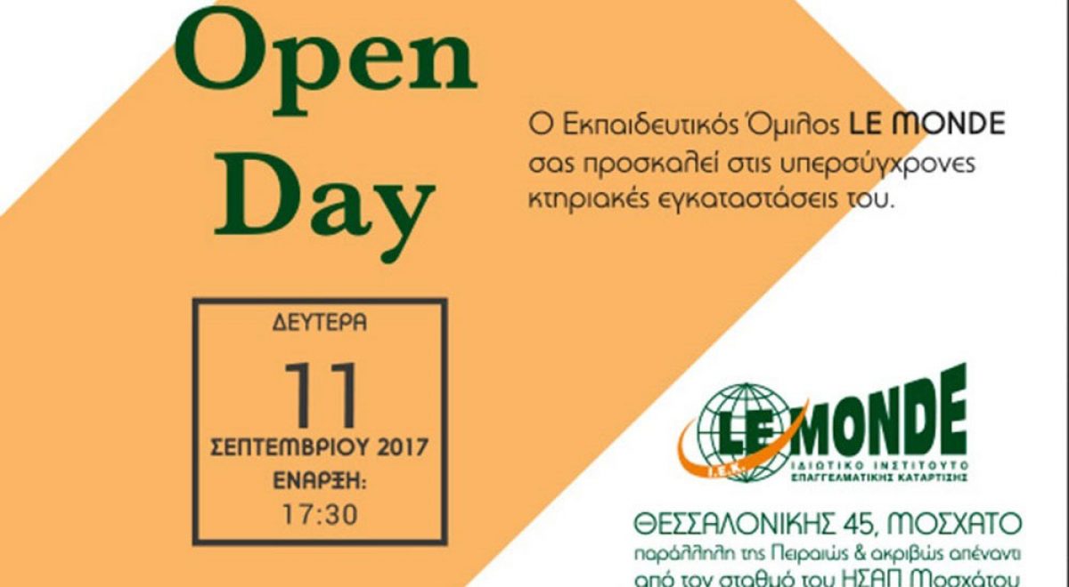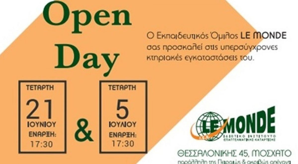 Την Πέμπτη 20 Σεπτεμβρίου στις 17.30 ο εκπαιδευτικός όμιλος LE MONDE οργανώνει open day στις εγκαταστάσεις του. Είναι ευκαιρία να γνωρίσετε τους διδάσκοντες, να επισκεφθείτε τα εργαστήρια, να δοκιμάσετε γευστικά εδέσματα και κυρίως να ενημερωθείτε για τα προγράμματα σπουδών της σχολής, τα οποία είναι: Τεχνικός Τουριστικών