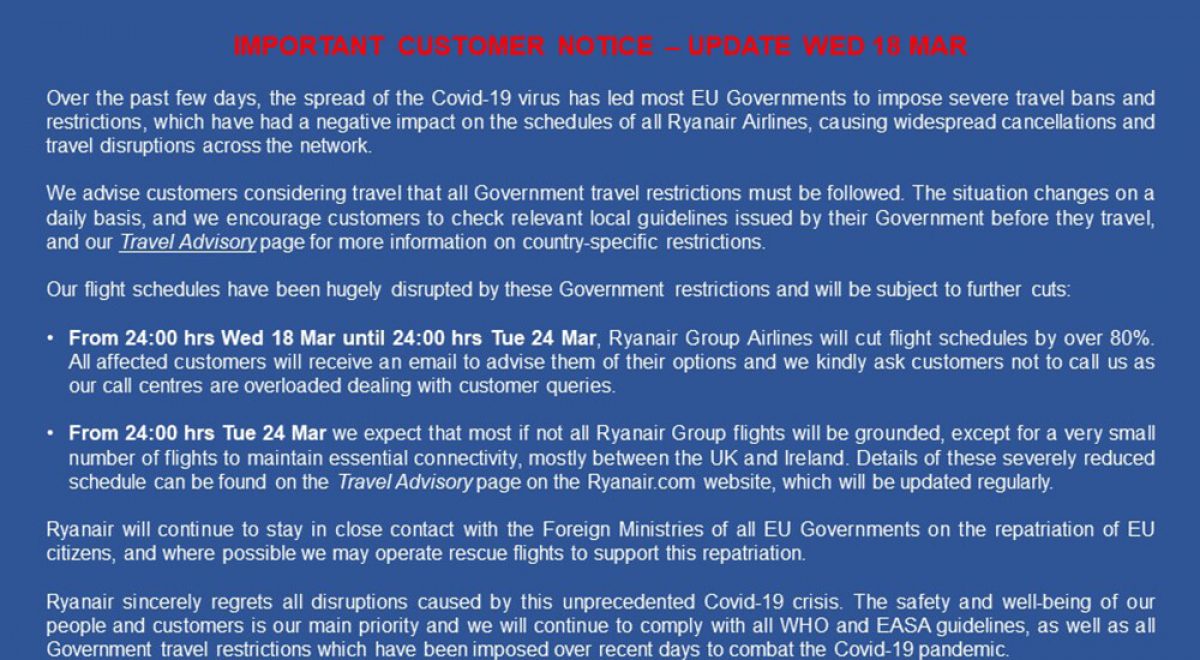 Tη ρευστότητά της με δάνειο, ύψους 600 εκατ. στερλινών (726 εκατ. δολάρια) ενίσχυσε η Ryanair Holdings, με τον αερομεταφορέα χαμηλού κόστους να προβλέπει ότι η κρίση εξαιτίας του κορoνοϊού θα μειώσει περισσότερο από το ήμισυ την επιβατική κίνηση έως και το Μάρτιο του 2021, ενώ
