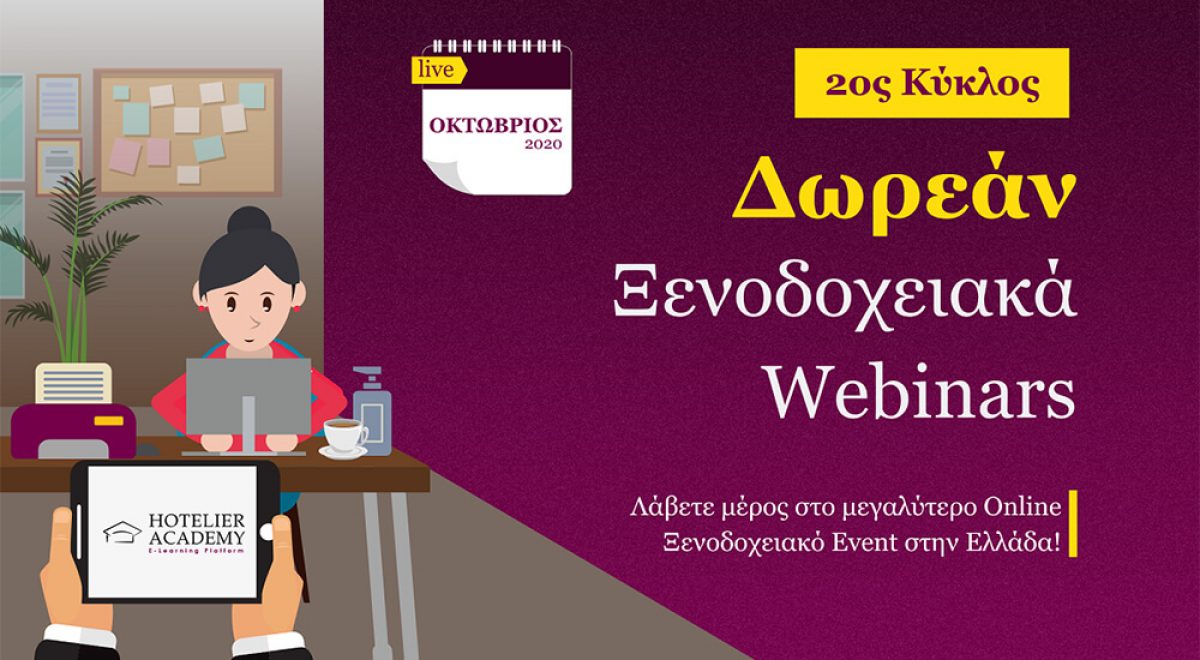 Έπειτα από την τεράστια επιτυχία του πρώτου κύκλου με πάνω από 5.700 συμμετέχοντες και 200.000 video views στα social media, τα δωρεάν live webinars της Hotelier Academy επανέρχονται με νέες εκπαιδευτικές θεματολογίες, καλύπτοντας τα νέα trends του F&B, του Housekeeping αλλά και των Πωλήσεων των