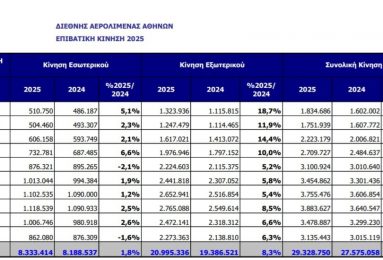 Τους πρώτους 10 μήνες (Ιανουάριος - Οκτώβριος) του 2025, η κίνηση του αεροδρομίου Αθήνας έφθασε τους 29.328.750 επιβάτες, σημειώνοντας αύξηση
