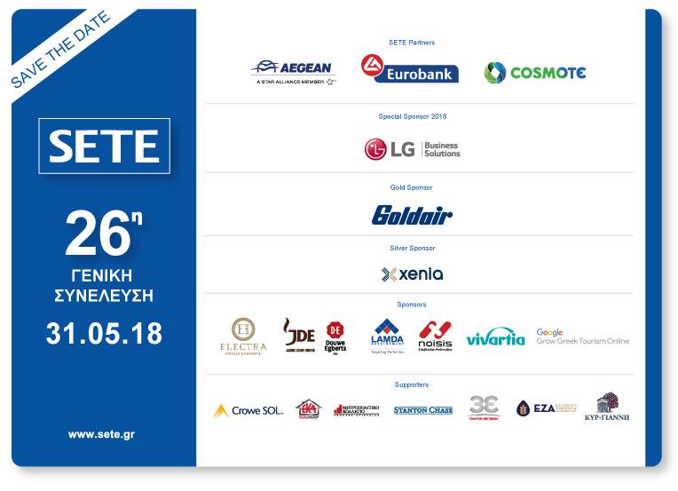 Την Πέμπτη, 31 Μαΐου 2018, ώρα 19:30 στο Μέγαρο Μουσικής Αθηνών, αίθουσα Χρήστος Λαμπράκης, θα πραγματοποιηθεί η 26η Τακτική Γενική Συνέλευση του Συνδέσμου Ελληνικών Τουριστικών Επιχειρήσεων (ΣΕΤΕ).