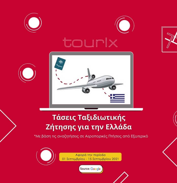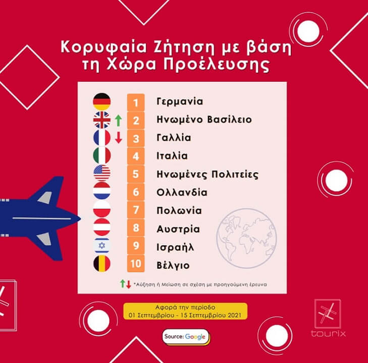 Σύμφωνα με τις τάσεις της ταξιδιωτικής ζήτησης για αεροπορικές πτήσεις προς στην Ελλάδα, το διάστημα 1 – 15 Σεπτεμβρίου 2021, στην κατάταξη των χωρών με τη μεγαλύτερη ζήτηση για πτήσεις προς τη χώρα μας, βάσει αναζητήσεων: