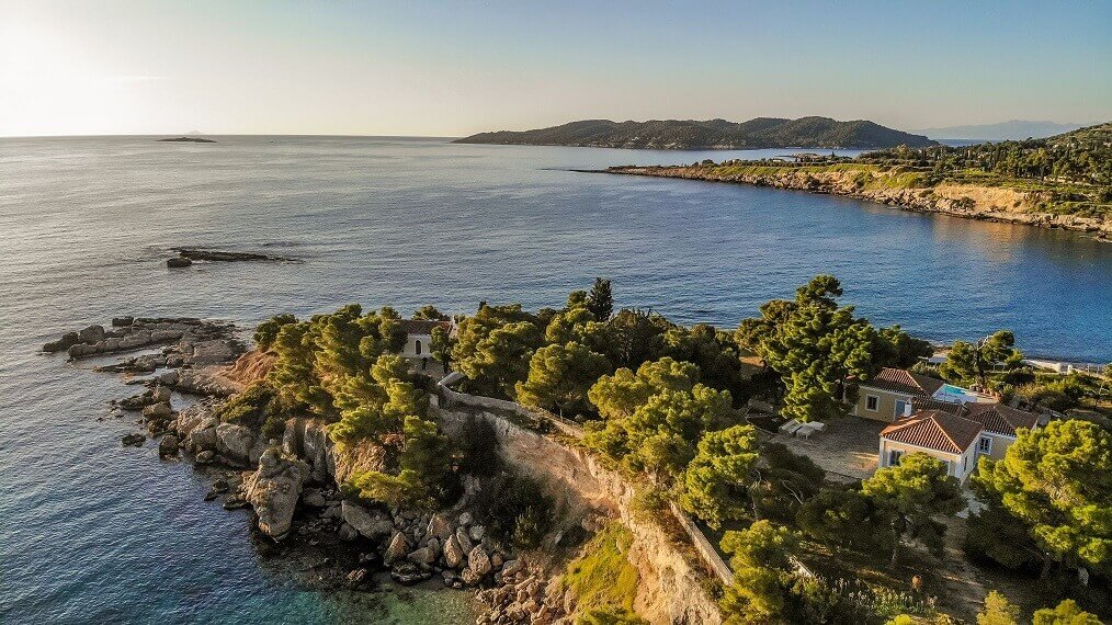 Σε ένα καταπράσινο ακρωτήρι στην κοσμοπολίτικη περιοχή της Αγίας Μαρίνας, το Pine Estate φωλιάζει ανάμεσα σε πεύκα, ελαιόδεντρα, φοίνικες και κυπαρίσσια σε μια έκταση, η οποία ξεχωρίζει για το πανέμορφο φυσικό περιβάλλον και την 360o πανοραμική θέα που απλώνεται από τα νησάκια της Σπετσοπούλας, του Τρίκερι και του Αγίου Ιωάννη έως και την Ύδρα.