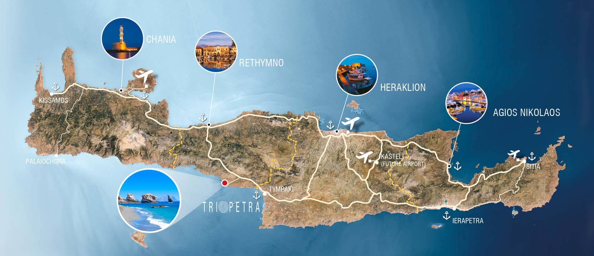 Σε έκταση 1.200 στρεµµάτων, που βρίσκεται στην περιοχή Τριόπετρα, στη νότια πλευρά του νομού Ρεθύμνου της Κρήτης, η κυπριακών συµφερόντων εταιρεία Emerald Developments του Φώτου Φωτιάδη, θα δημιουργήσει ένα ολοκληρωµένο τουριστικό συγκρότηµα.