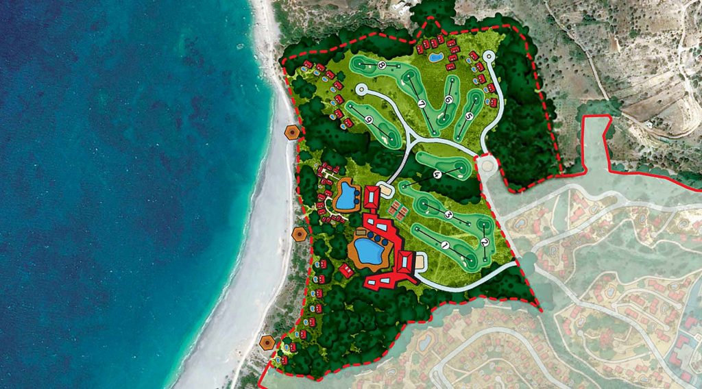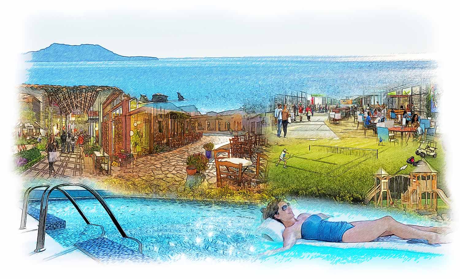 Η πρώτη φάση θα υλοποιηθεί σε έκταση περίπου 270 στρεµµάτων και θα περιλαμβάνει ένα 5άστερο ξενοδοχείο 155 δωµατίων (από τα οποία 29 θα είναι σουίτες και έξι βίλες), 23 υπερπολυτελείς κατοικίες 250 – 550 τ.µ. η καθεµία και 10 µικρότερου µεγέθους, κέντρο θαλασσοθεραπείας 2.700 τ.µ., γήπεδο γκολφ εννέα οπών και συνεδριακό κέντρο 1.400 τ.µ.
