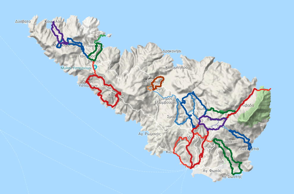 Πρόκειται για δώδεκα διαδρομές με εξαιρετική σηματοδότηση («Από τη θάλασσα στον ουρανό», «Γεωδιαδρομή», «Φύση σε αντιθέσεις», «Μαρμαροχώρια», «Στράτα των μύλων» κ.ά.).