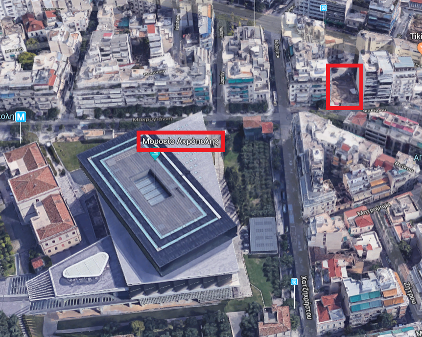 Στη φωτογραφία διακρίνεται αριστερά το μουσείο της Ακρόπολης και δεξιά σε κόκκινο πλαίσιο το οικόπεδο που κατασκευάζεται το ξενοδοχείο
