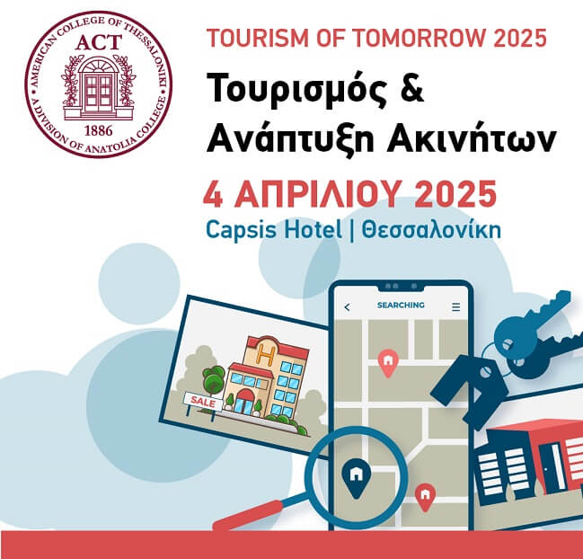 Η σχέση μεταξύ της αγοράς ακινήτων και της τουριστικής ανάπτυξης βρίσκεται στο επίκεντρο του 8ου Συνεδρίου του Ακαδημαϊκού Προγράμματος Τουρισμού και Φιλοξενίας του ACT (The American College of Thessaloniki), το οποίο θα πραγματοποιηθεί σήμερα (Παρασκευή 4 Απριλίου 2025), στις 15:30 στο Capsis Hotel Thessaloniki.