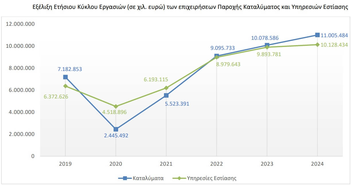 To 2024, o κύκλος εργασιών (τζίρος) των επιχειρήσεων του κλάδου των καταλυμάτων ανήλθε σε 11.005.484.313 ευρώ, σημειώνοντας αύξηση 9,2% σε σχέση με το 2023, όπου είχε ανέλθει σε 10.078.585.807 ευρώ.
