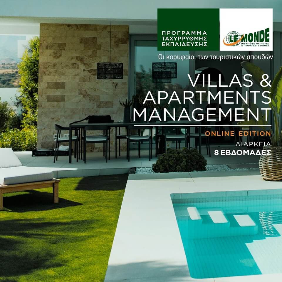 To Villas & Apartments Management, είναι το νέο online πρόγραμμα εξειδίκευσης στη διαχείριση πολυτελών κατοικιών & διαμερισμάτων από τον Εκπαιδευτικό Όμιλο LE MONDE.