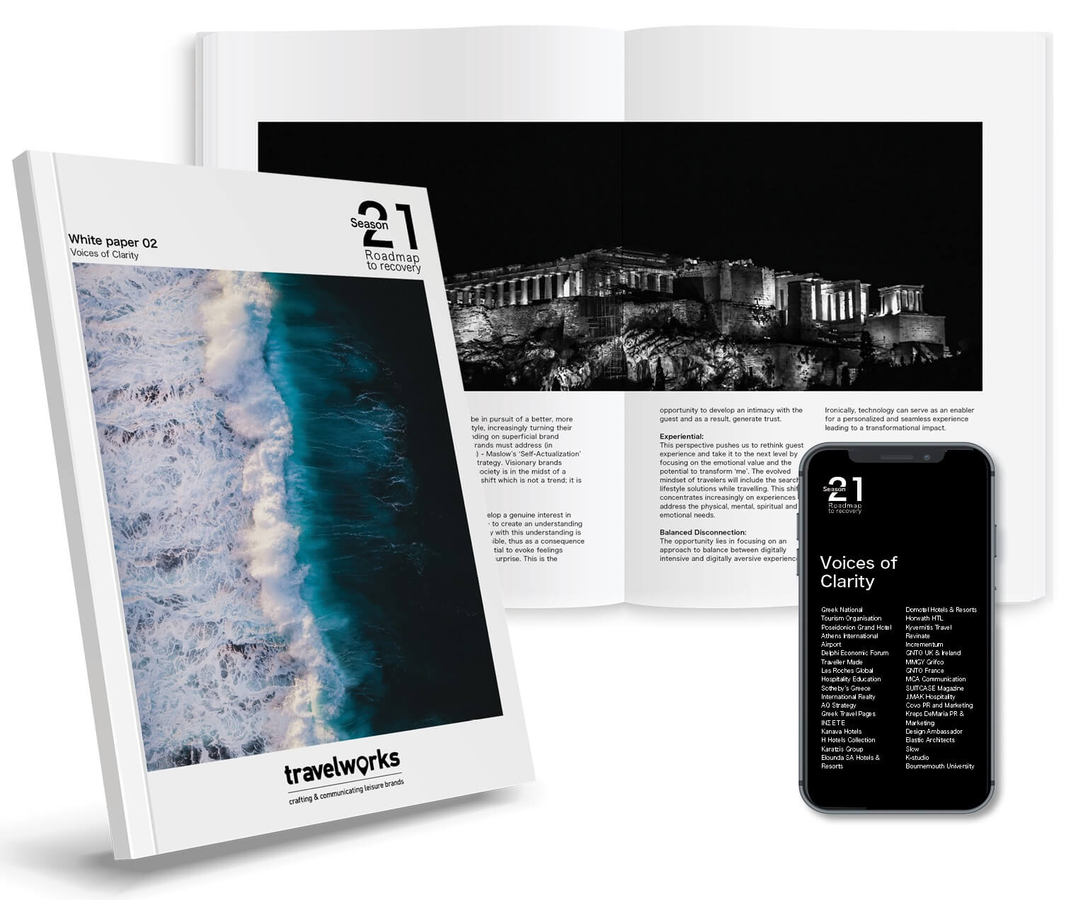 Σε συνέχεια του πρώτου white paper, Season 21 «Roadmap to Recovery», η Travelworks Public Relations δημοσίευσε τη δεύτερη ενότητα: «Voices of Clarity», στην οποία συγκεντρώνονται οι απόψεις 32 leaders του hospitality από Ελλάδα, Βρετανία, Γαλλία, Γερμανία, Ελβετία, Ολλανδία και Ηνωμένες Πολιτείες για το μέλλον της φιλοξενίας, τις αλλαγές που θα έρθουν και το δρόμο για την ανάκαμψη.