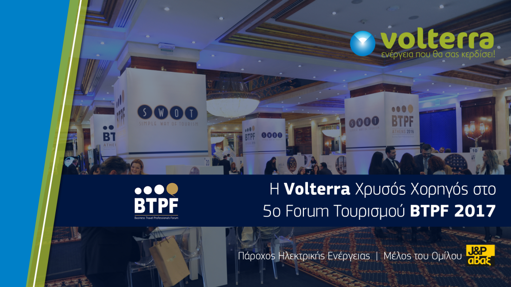 Η Volterra ΑΕ, δηλώνει δυναμικό παρόν στο 5o διεθνές forum τουρισμού Business Travel Professionals Forum (BTPF) 2017, το οποίο οργανώνεται την Τετάρτη 1 Νοεμβρίου 2017, στο «Κέντρο Πολιτισμού – Ίδρυμα Σταύρος Νιάρχος» από την εταιρεία Ανάπτυξης & Προώθησης Τουριστικών Επιχειρήσεων, SWOT.