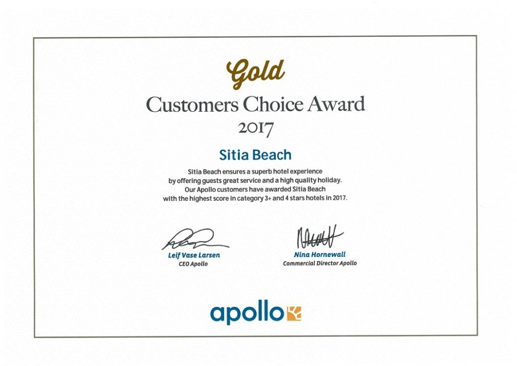 Μοναδική ήταν η βράβευση για το Sitia Beach City Resort & Spa (φωτογραφία) του ομίλου Cyan group of hotels αφού κατάφερε να αποσπάσει το βραβείο Gold Customers Choice Award 2017 από τον ταξιδιωτικό οργανισμό Apollo σε συνεργασία με την εταιρεία εισερχόμενου τουρισμού Destination Touristic Services Hellas.