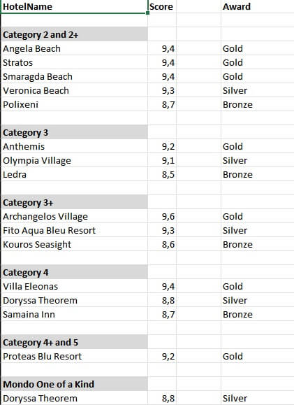 Στη συνέχεια της βραδιάς έγινε η καθιερωμένη βράβευση των ξενοδοχείων του νησιού, σύμφωνα με τα ερωτηματολόγια των πελατών του Apollo, με βαθμολογίες πολύ υψηλές που αποδεικνύουν ότι κάθε χρόνο ανεβαίνει όλο και ψηλότερα ο πήχης των παρεχόμενων υπηρεσιών έχοντας ως αποτέλεσμα την ολοένα αυξανόμενη ικανοποίηση των πελατών με αποτέλεσμα η Σάμος να έχει ένα από τα τρία υψηλότερα NPS στον κόσμο για το Apollo.
