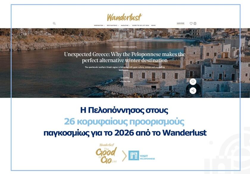 Στο αφιέρωμά του, το Wanderlust αναδεικνύει την Πελοπόννησο ως έναν τόπο όπου μύθοι, ιστορία, κινηματογράφος, αυθεντικά τοπία και σύγχρονες εμπειρίες συνθέτουν έναν μοναδικό προορισμό διεθνούς ενδιαφέροντος.