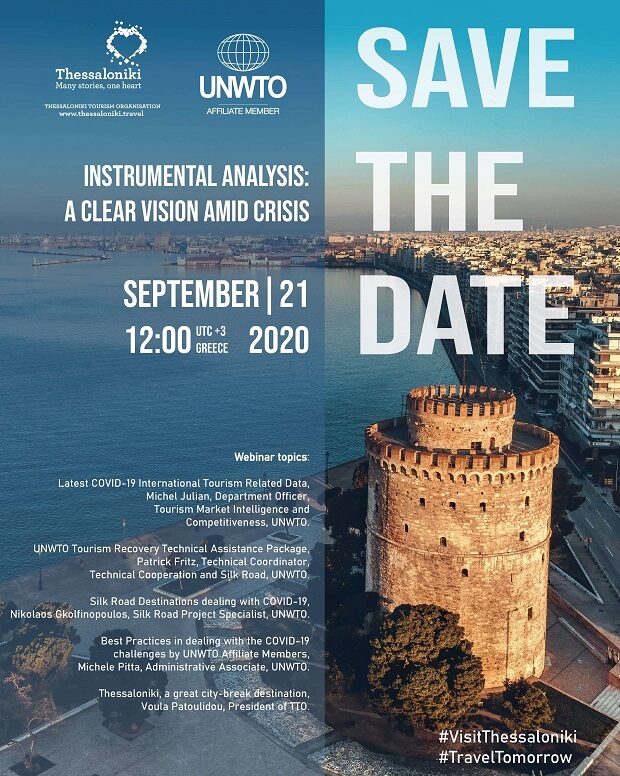 Ο Οργανισμός Τουρισμού Θεσσαλονίκης διοργανώνει, σε συνεργασία με τον Παγκόσμιο Οργανισμό Τουρισμού, του οποίου είναι συνδεδεμένο μέλος, webinar με θέμα «Instrumental Analysis: A clear vision amid crisis», τη Δευτέρα 21 Σεπτεμβρίου 2020 στις 12:00 μ.μ.