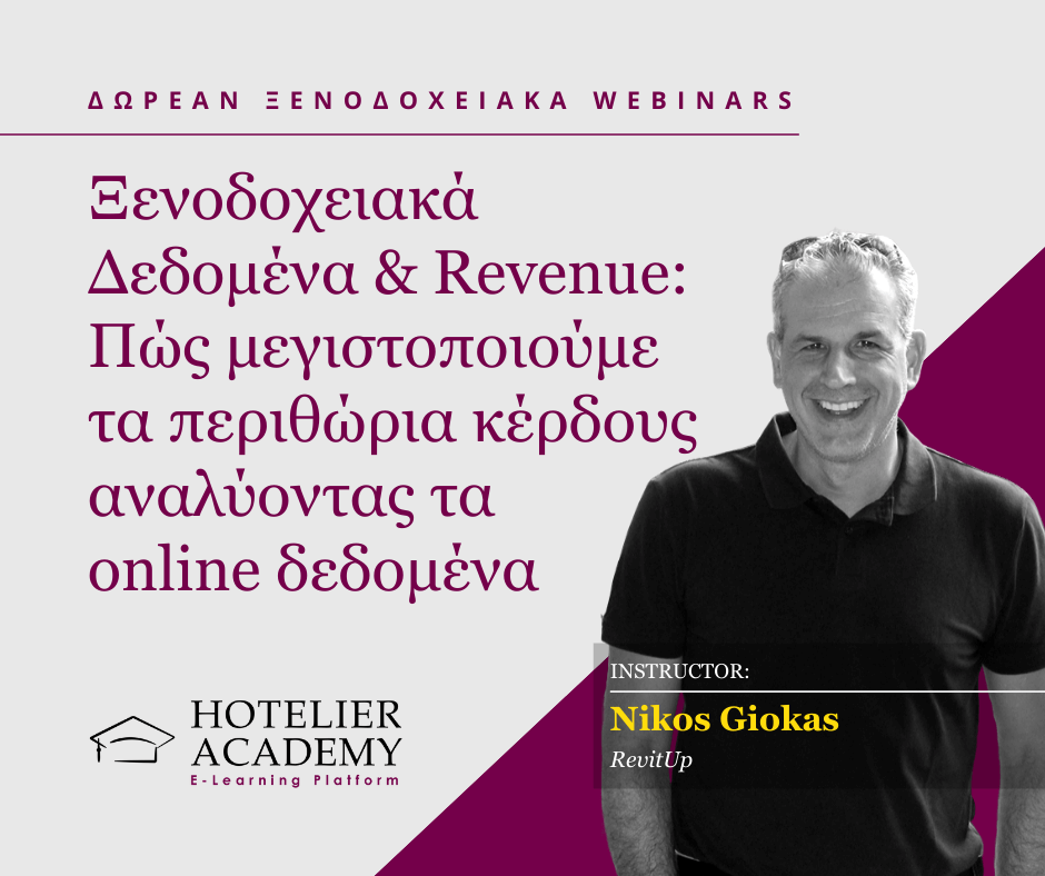 «Ξενοδοχειακά δεδομένα & Revenue: Πώς μεγιστοποιούμε τα περιθώρια κέρδους αναλύοντας online δεδομένα», είναι ο τίτλος του webinar της Hotelier Academy, που θα πραγματοποιηθεί την Παρασκευή 3 Απριλίου στις 17:00 μ.μ. και στο οποίο εισηγητής είναι ο Νίκος Γκιόκας, ο Business Development Manager της www.revitup.direct