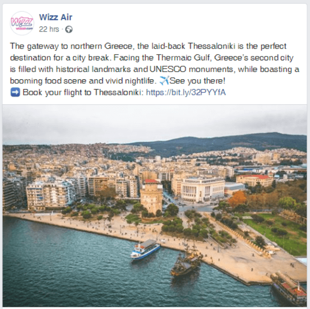 Με πρωτοβουλία του Οργανισμού Τουρισμού Θεσσαλονίκης (ΟΤΘ), στο πλαίσιο συνεργασίας ΟΤΘ – Fraport Greece και με σκοπό την υποστήριξη των δύο πτήσεών της από Λονδίνο και Κίεβο προς Θεσσαλονίκη, η Wizz Air, ανέλαβε και παρουσιάζει στην επίσημη σελίδα της στο Facebook την πόλη ως ιδανικό city break προορισμό για τη γαστρονομία, για τα μνημεία Unesco και για αναψυχή.