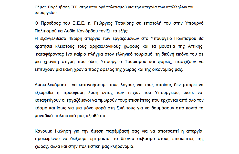Ο Πρόεδρος του Ξενοδοχειακού Επιμελητηρίου Ελλάδας (ΞΕΕ), Γεώργιος Τσακίρης, απέστειλε επιστολή στην Υπουργό Πολιτισμού Λυδία Κονιόρδου για την εξαγγελθείσα 48ωρη απεργία των εργαζομένων στο Υπουργείο Πολιτισμού, που θα κρατήσει κλειστούς τους αρχαιολογικούς χώρους και τα μουσεία της Αττικής στις 29 και 30 Ιουλίου.