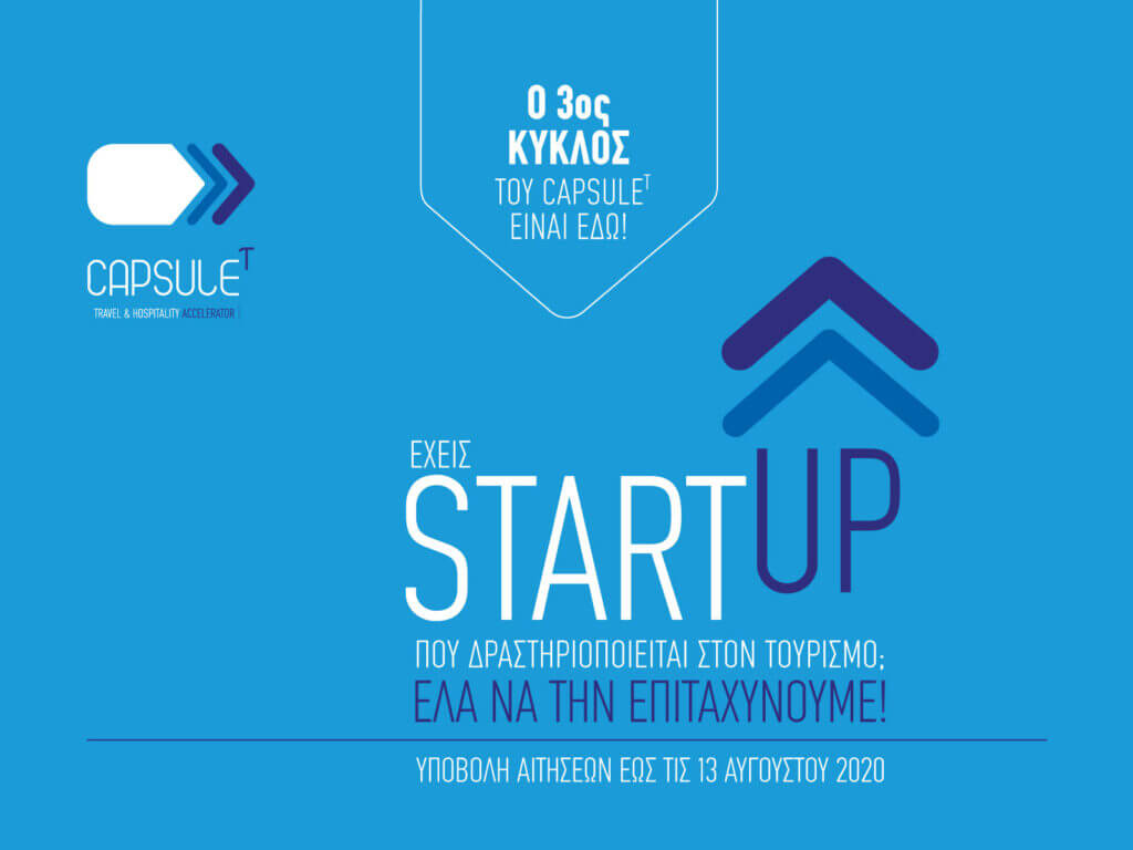 Άνοιξε από χθες η περίοδος αιτήσεων για την ένταξη νεοφυών επιχειρήσεων τεχνολογίας -που δραστηριοποιούνται στον τουρισμό- στον 3ο κύκλο του Προγράμματος Επιτάχυνσης (Σεπτέμβριος – Δεκέμβριος 2020) του CapsuleT Travel & Hospitality Accelerator, του πρώτου ελληνικού επιταχυντή αποκλειστικά για τουριστικές startups που έχει δημιουργήσει το Ξενοδοχειακό Επιμελητήριο Ελλάδος (ΞΕΕ).