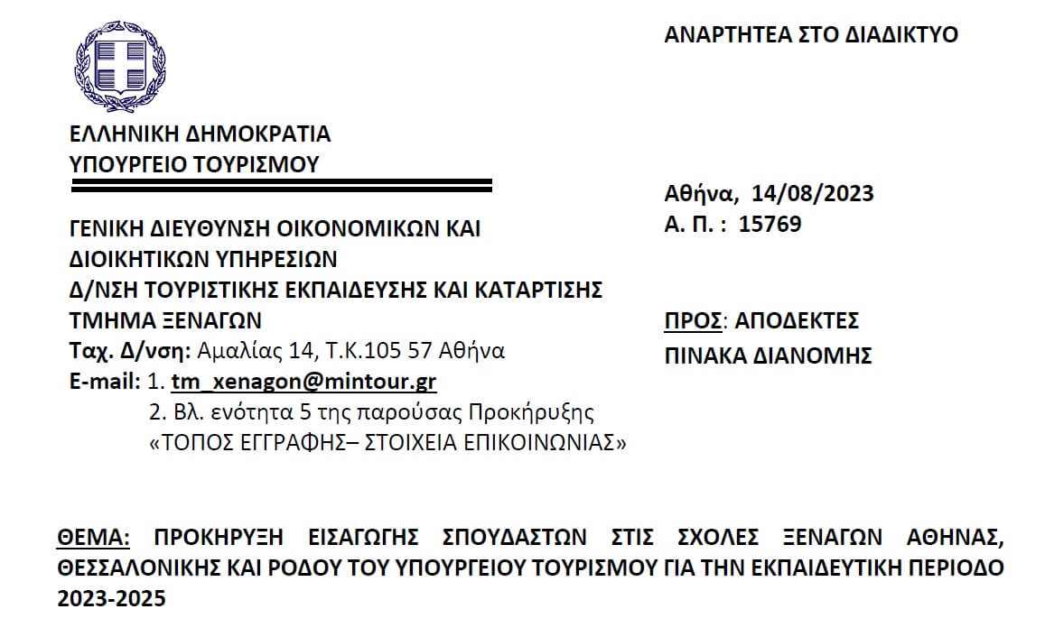 Δείτε την προκήρυξη εισαγωγής σπουδαστών στις σχολές ξεναγών ΕΔΩ.