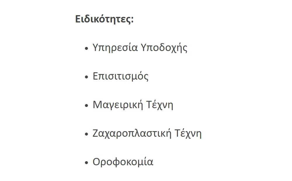 Πέντε ειδικότητες: (α) Υπηρεσία Υποδοχής, (β) Επισιτισμός, (γ) Μαγειρική τέχνη, (γ) Ζαχαροπλαστική τέχνη, (ε) Οροφοκομία.