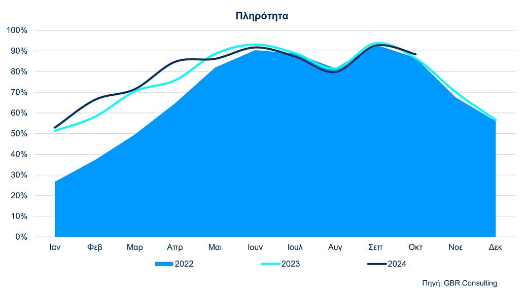 Σε επίπεδο 10μηνου 2024, συγκρίνοντας τις πόλεις της Μεσογείου Ρώμη, Βαρκελώνη, Μαδρίτη και Κωνσταντινούπολη, η πληρότητα της Αθήνας παρουσίασε μικρή αύξηση (+1,6% σε σύγκριση με την αντίστοιχη περίοδο πέρυσι), ενώ η πληρότητα σε Μαδρίτη και Κωνσταντινούπολη αυξήθηκε κατά 4,7% και 6,6% αντίστοιχα.