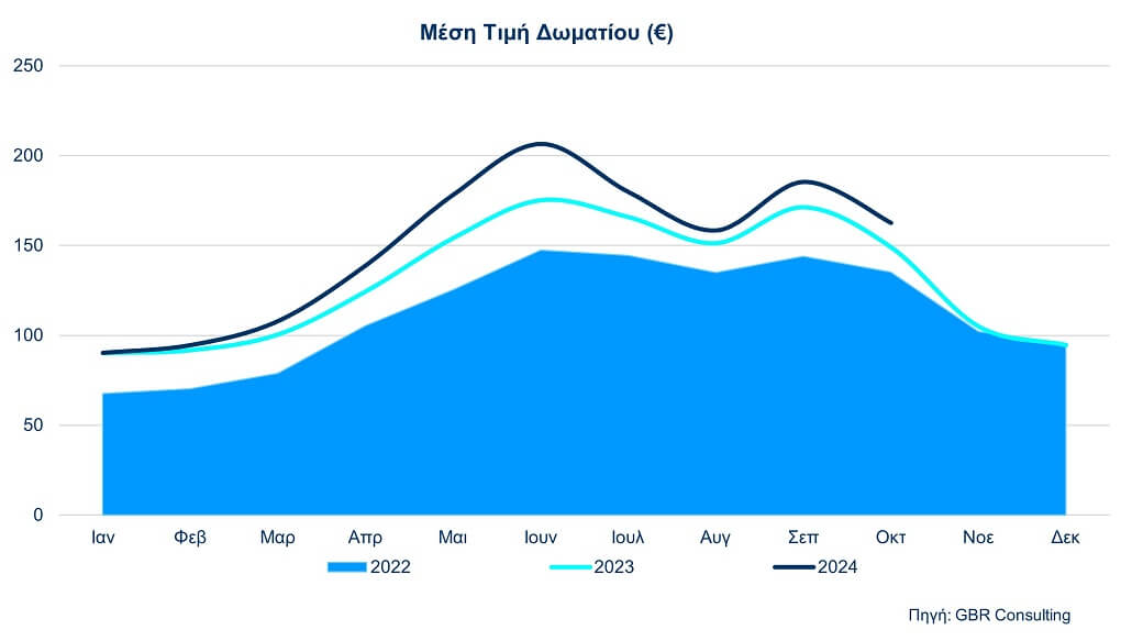 Από πλευράς μέσης τιμής δωματίου (ADR) ο Οκτώβριος 2024 ήταν καλύτερος κατά 9% έναντι του Οκτωβρίου 2023. Αντίστοιχα και σε επίπεδο 10μήνου η μέση τιμή σημείωσε αύξηση της τάξης του 8,9%.