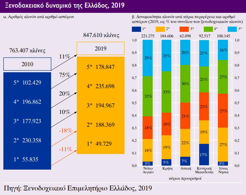 Το 2019 η χώρα μας διαθέτει 9.917 ξενοδοχεία, συνολικής δυναμικότητας 430.402 δωματίων και 847.610 κλινών.