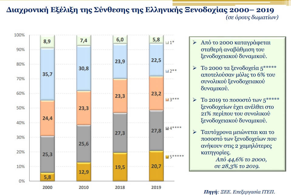 Τα παραπάνω αποτυπώνονται στην ετήσια έρευνα για την ξενοδοχειακή αγορά, με τίτλο: «Εξελίξεις στα Βασικά Μεγέθη της Ελληνικής Ξενοδοχίας 2019», που διενήργησε το Ινστιτούτο Τουριστικών Ερευνών και Προβλέψεων (ΙΤΕΠ) για λογαριασμό του Ξενοδοχειακού Επιμελητηρίου της Ελλάδας (ΞΕΕ).