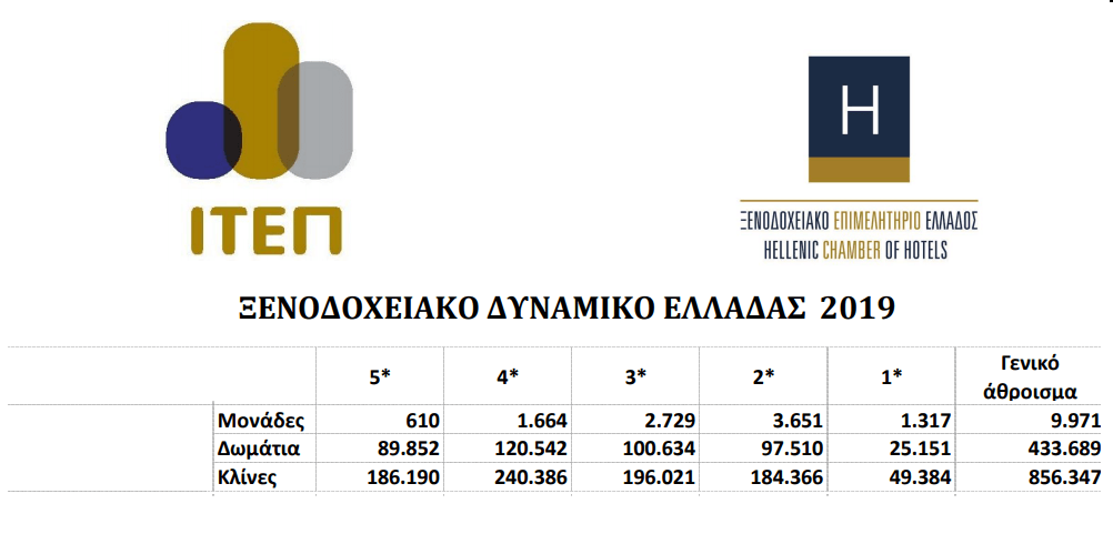 Το ξενοδοχειακό δυναμικό της Ελλάδας το 2019 και συγκεκριμένα στις 31 Δεκεμβρίου, ήταν 9.971 ξενοδοχεία με 433.689 δωμάτια και 856.347 κλίνες, σύμφωνα με τα στοιχεία που αναρτήθηκαν στην ιστοσελίδα του Ξενοδοχειακού Επιμελητηρίου της Ελλάδας (ΞΕΕ).
