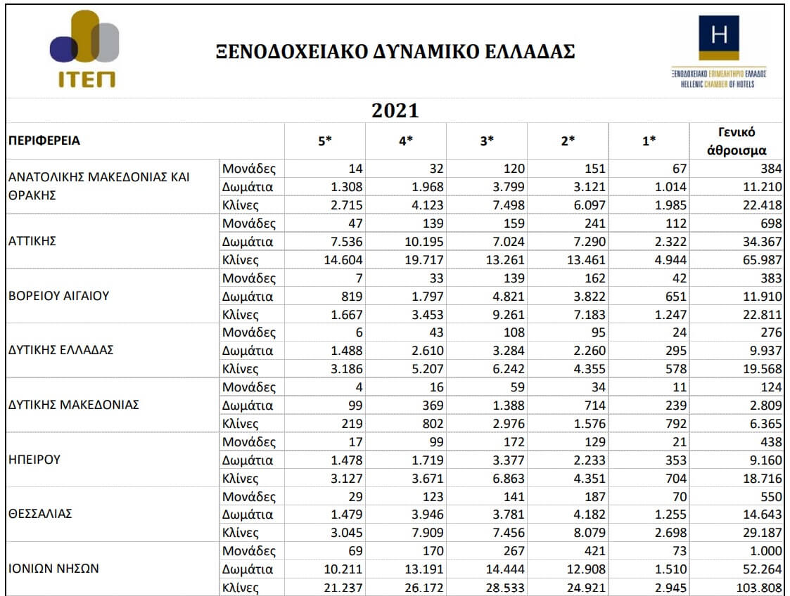 Δείτε ΕΔΩ το ξενοδοχειακό δυναμικό της Ελλάδας το 2021 ανά Περιφέρεια – Νομό – νησί.