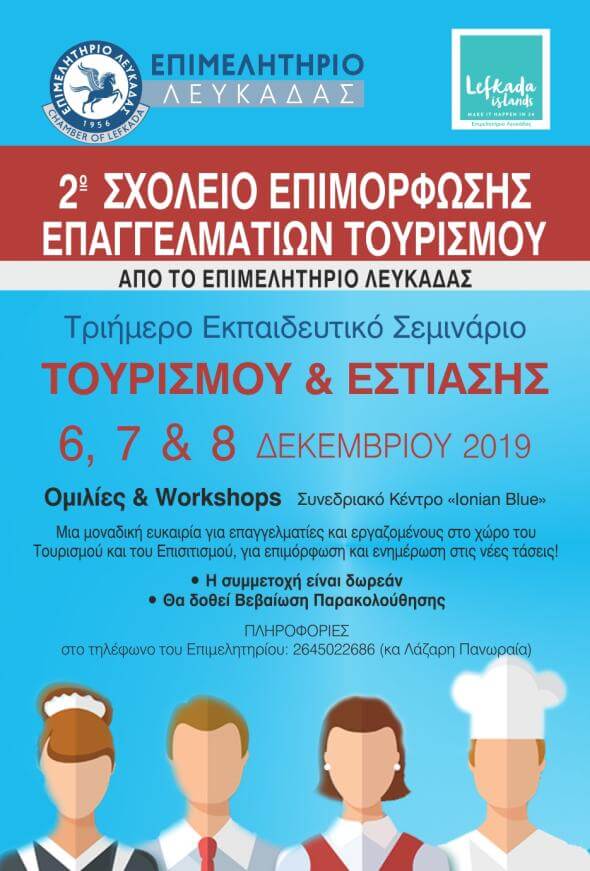 Υπό την αιγίδα του ΕΟΤ, πραγματοποιείται από σήμερα Παρασκευή 6 έως την Κυριακή 8 Δεκεμβρίου το 2o Σχολείο Επιμόρφωσης Επαγγελματιών Τουρισμού, που διοργανώνει το Επιμελητήριο Λευκάδας με κεντρικό θέμα τα καταλύματα και την εστίαση.