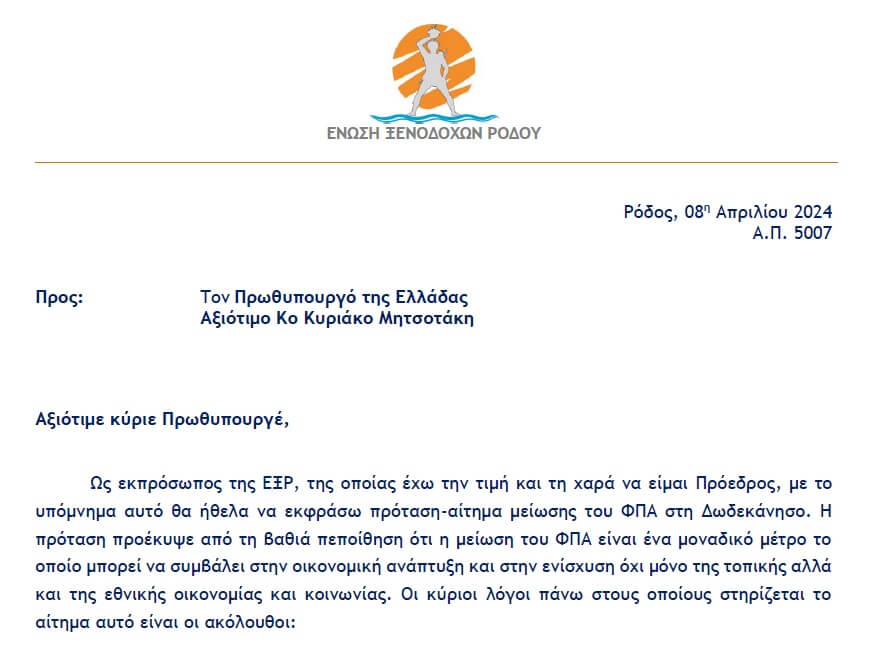 O Πρόεδρος της Ένωσης Ξενοδόχων Ρόδου (ΕΞΡ), Γιάννης Παπαβασιλείου, τη Δευτέρα 08/04, κατέθεσε υπόμνημα στον Πρωθυπουργό Κυριάκο Μητσοτάκη, με πρόταση – αίτημα τη μείωση του ΦΠΑ στα Δωδεκάνησα.