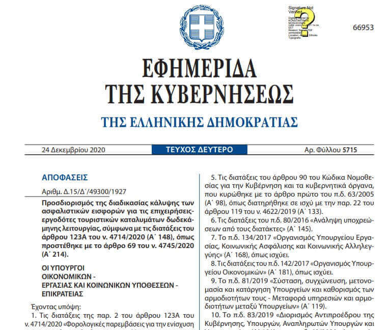 «Προσδιορισμός της διαδικασίας κάλυψης των ασφαλιστικών εισφορών για τις επιχειρήσεις εργοδότες τουριστικών καταλυμάτων δωδεκάμηνης λειτουργίας, σύμφωνα με τις διατάξεις του άρθρου 123Α του ν. 4714/2020 (Α΄ 148), όπως προστέθηκε με το άρθρο 69 του ν. 4745/2020 (Α΄ 214)».