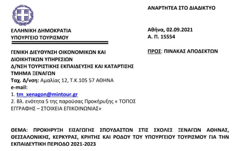 Δημοσιεύθηκε η πρόσκληση υποβολής αιτήσεων των υποψηφίων για εισαγωγή στις Σχολές Ξεναγών του Υπουργείου Τουρισμού.