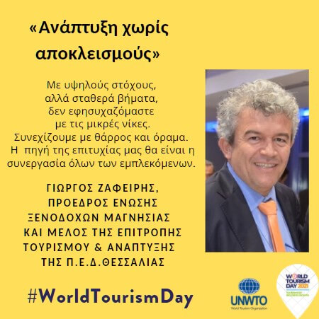 Μήνυμα από το Γιώργο Ζαφείρη, Πρόεδρο της Ένωσης Ξενοδόχων Μαγνησίας και Μέλος της Επιτροπής Τουρισμού & Ανάπτυξης της Π.ΕΔ. Θεσσαλίας για τη χθεσινή (27/09) Παγκόσμια Ημέρα Τουρισμού 2021.